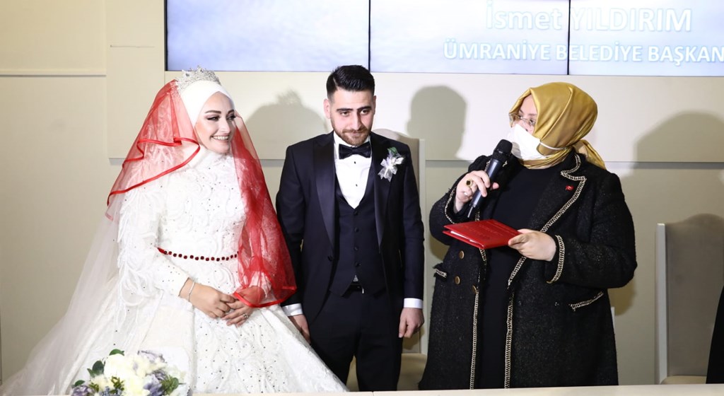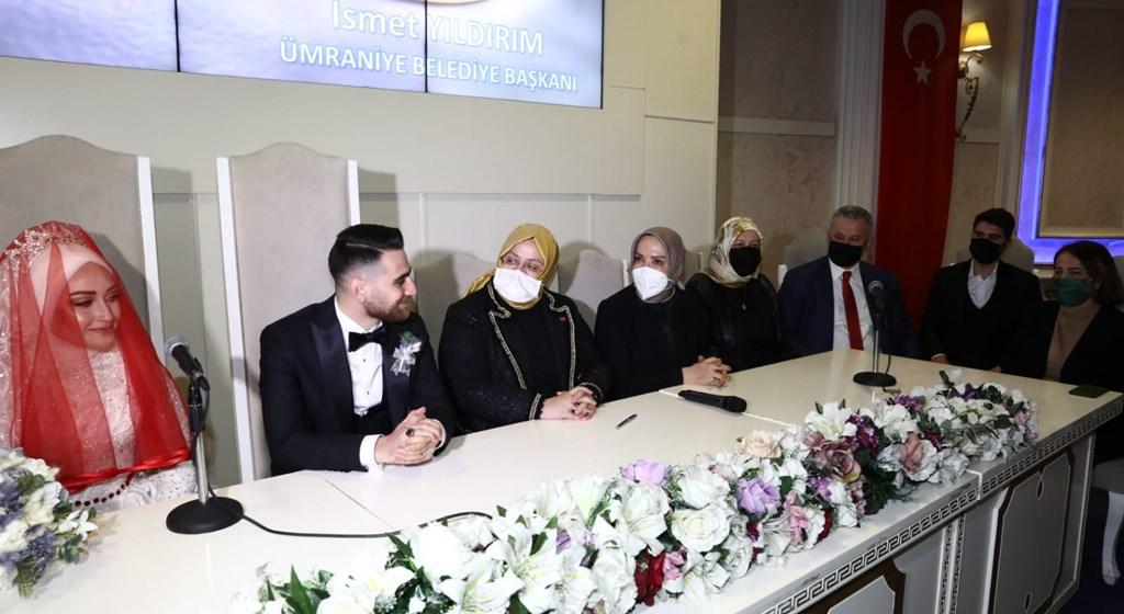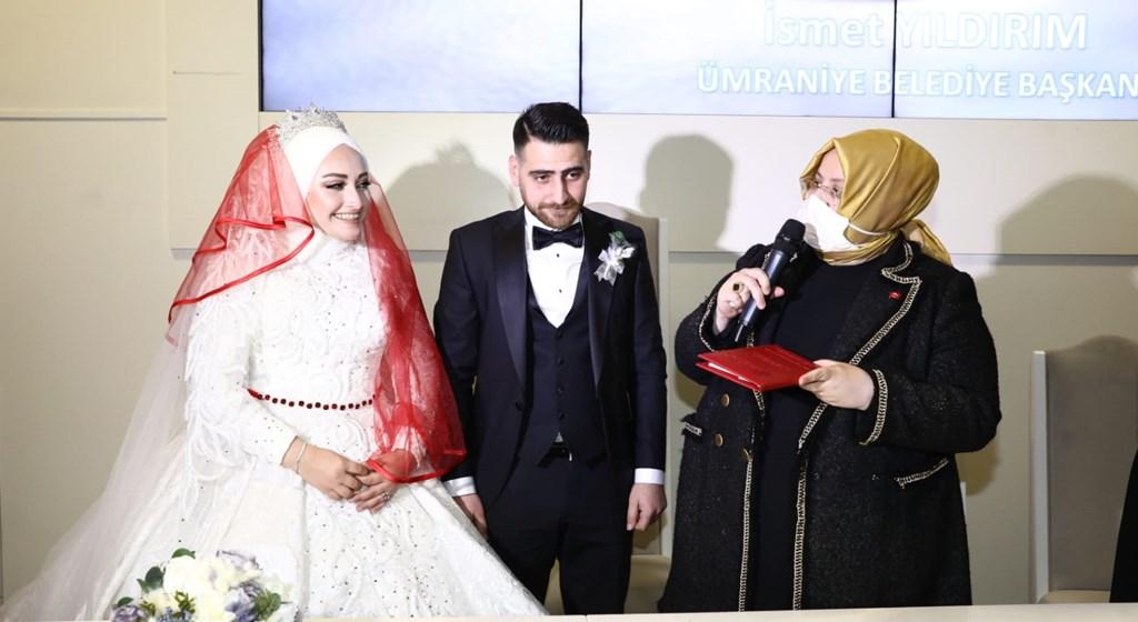 Aile cüzdanını geline veren Bakan Selçuk, Hümeyra-Enes çiftine, “Allah iki cihan saadeti nasip etsin” dedi.