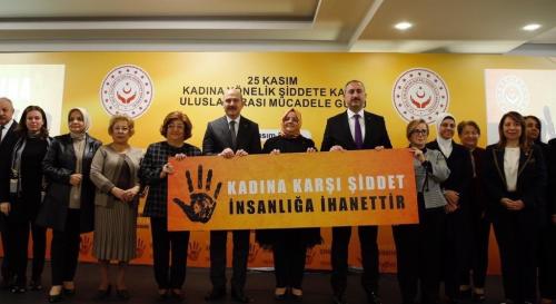 Aile, Çalışma ve Sosyal Hizmetler Bakanı Zehra Zümrüt Selçuk, İçişleri Bakanı Süleyman Soylu ve Adalet Bakanı Abdülhamit Gül, Kadına Yönelik Şiddet ile Mücadele Günü kapsamında Ankara Hakimevinde düzenlenen etkinlikte bir araya geldi. Bakanlar “Kadına karşı şiddet insanlığa ihanettir” pankartı kaldırarak birlikte mücadele mesajı verdi. Bakan Selçuk da sanatçı, sporcu ve medya başta olmak üzere toplumun her kesimini şiddet ile mücadeleye destek olmaya çağırdı.