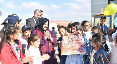 Kız çocukları ve basın çalışanlarıyla ebru yapan Bakan Selçuk, çocukların yaptığı takı, tablo ve çeşitli ürünlerin yer aldığı sergiyi de gezdi, sonra da çocukları hediyelerle sevindirdi.