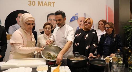 Emine Erdoğan, daha sonra Mutfak Atölyesi’ne geçerek, “sıfır atık yemeği”nin yapılması için şef Arda Türkmen’e eşlik etti. Erdoğan’ın Türkmen’le yaptığı sebze yemeğinin kabuklarından mücver yapıldı, diğer organik atıklar ise kompost gübre olmak üzere değerlendirildi. Erdoğan’a eşlik eden Bakan Selçuk şeflerle hatıra fotoğrafı da çektirdi.